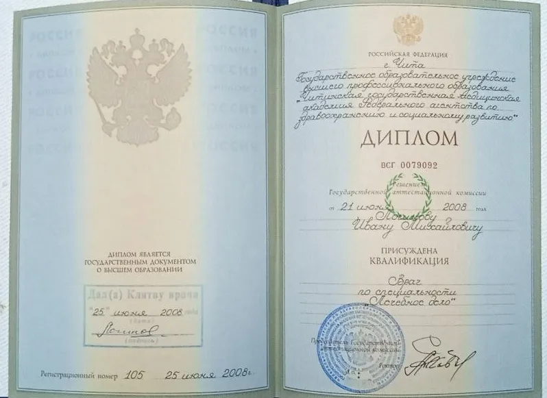 • 2015 — ФГБОУ ВО "Читинская государственная медицинская академия" (Организация здравоохранения и общественное здоровье);